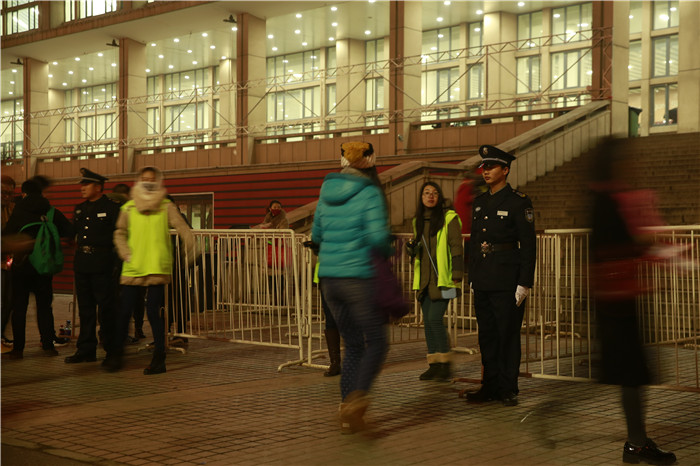 演唱会现场观众爆满,广大保安员在执勤中一丝不苟,认真履行职责。在场馆外,负责场院护栏警戒的保安员站在残雪中坚守岗位,负责巡控的保安员交叉巡视,负责观众入口处的保安员确保观众有序进入,负责西北门交通疏导的保安员认真指挥车辆。在馆内,有的观众因为坐位发生争执,保安员及时制止,并将双方当事人带到治安处理点进行处理;保安员在巡控中查获假证件6人次;在台前贵宾区执勤保安员集中精力观察观众席上的情况,防止观众从看台上往下跳;负责环廊疏导的保安员坚持文明执勤,一次次地清理停留在通道上的观众,特别是保安员魏俊兴在劝阻一名女孩站在通道上拍照时,遭到女孩和其男友的大声指责,魏俊兴沉着冷静,忍辱负重,坚持原则,在现场其他保安员的协助下,还是将女孩劝回坐位上,确保了通道畅通。
