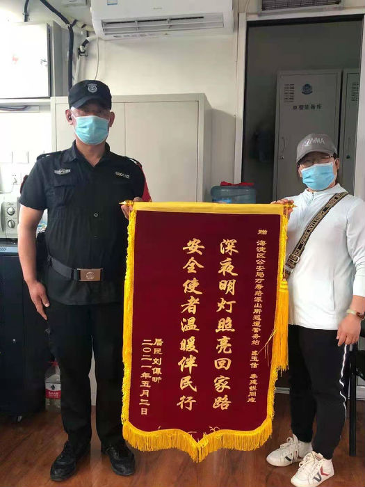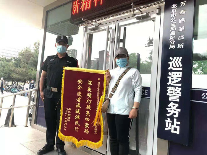 昨天,一位女士拿着一面锦旗来到五棵松巡逻警务站后,把锦旗赠送给保安员李建锐,并对李建锐再三表示感谢!锦旗上写着“深夜明灯照亮回家路、安全使者温暖伴民行”。